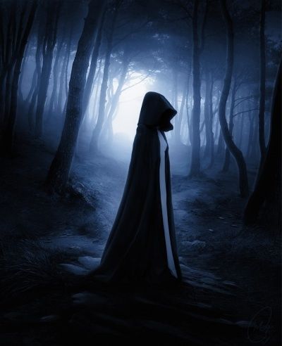 Into a Hooded cloak of onyx black she brushes back her golden locks